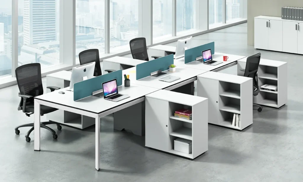 • Main Screen : 18mm thick coloured fabric finish magnetic screen, mounted on powder coated Studs.Table top : 25mm thick Pre-laminate particle board finished with 2mm edge lipping.Wire Management – 65 dia wire manager hole per workstation.